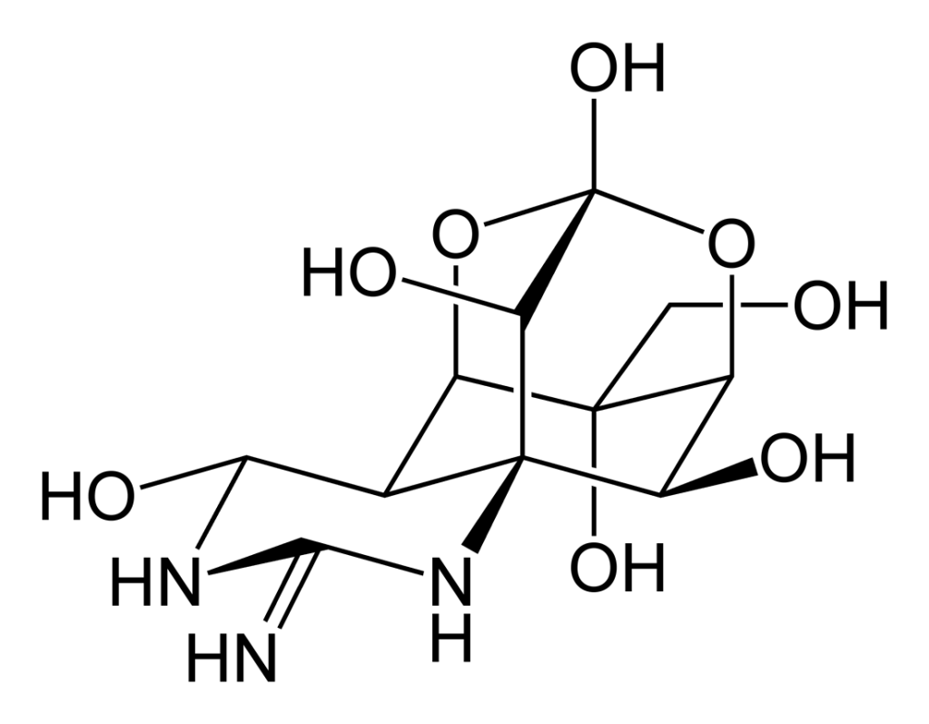 Questa tossina colpisce gravemente il sistema nervoso; essa, infatti impedisce il trasporto degli ioni sodio attraverso le membrane delle fibre nervose, causando il blocco della trasmissione degli impulsi nervosi. La morte sopraggiunge per paralisi e insufficienza respiratoria.
