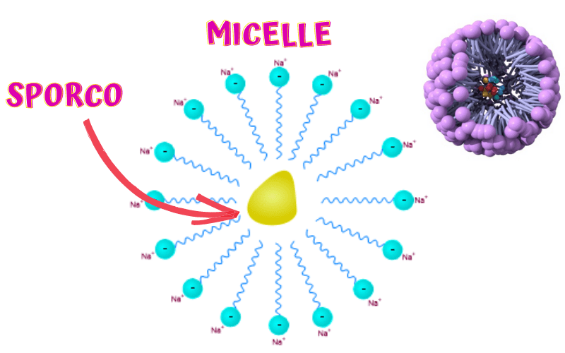 Il potere pulente della miscela acqua e sapone è attribuito all’azione delle micelle, ecco possiamo considerare le micelle come delle piccole sfere rivestite all’esterno di gruppi polari idrofili (ovvero solubili in acqua) e contenenti all’interno come una tasca idrofobica costituita dalle code idrofobiche che disciolgono le sostanze grasse.