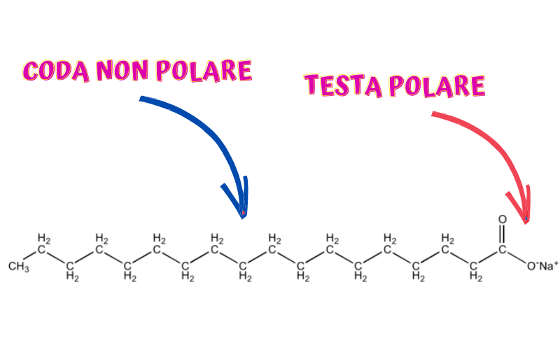 I saponi, che esplicano un’azione detergente, ma come fanno? La funzione dei saponi è eliminare lo sporco e il grasso, ovvero la molecola del sapone ha una testa idrofila ionizzata negativamente e una coda idrofobica, cioè non ama l’acqua detto semplicemente.