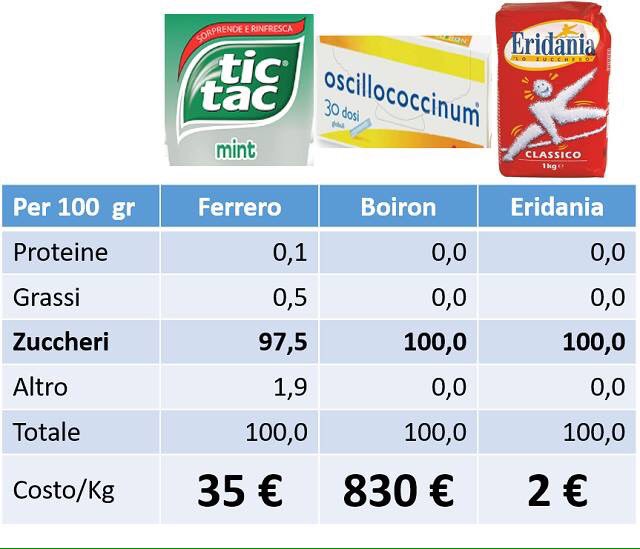 Quindi 1 grammo di prodotto contiene 1 grammo di zuccheri. Basta, nessun principio attivo. Voi curereste i vostri cari per patologie anche gravi con lo zucchero? Probabilmente no! Ma basta cambiare nome e immagine e il gioco è fatto. Risultato è pagare a peso d’oro lo zucchero…