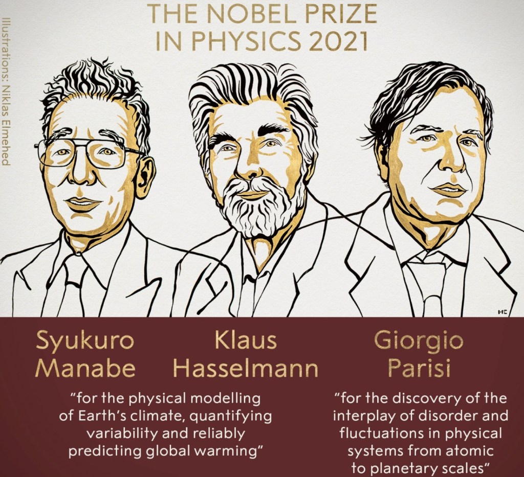 Il 5 Ottobre, la Reale Accademia Svedese per le scienze ha deciso di assegnare il Premio Nobel per la Fisica 2021: “per contributi innovativi alla nostra comprensione di sistemi fisici complessi” al fisico italiano Giorgio Parisi, assieme al tedesco Hasselmann (Max Planck Institute for Meteorology, Amburgo, Germania) e il giapponese Manabe (Princeton University, USA) “per la scoperta dell’interazione tra disordine e fluttuazioni nei sistemi fisici da scala atomica a scala planetaria”.