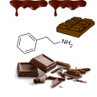 Probabilmente un’ altra molecola interessante è la feniletilamina. Rilasciata dal cervello quando si sperimentano sentimenti di gioia e amore. In chimica è definito come è un alcaloide. In natura è contenuta in diversi alimenti, tra i quali spiccano il cioccolato, i vini e gli alimenti che subiscono fermentazione microbica come i formaggi.