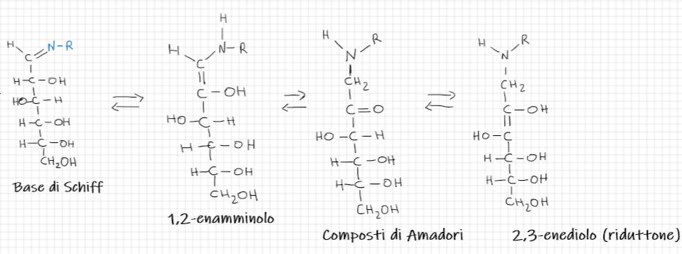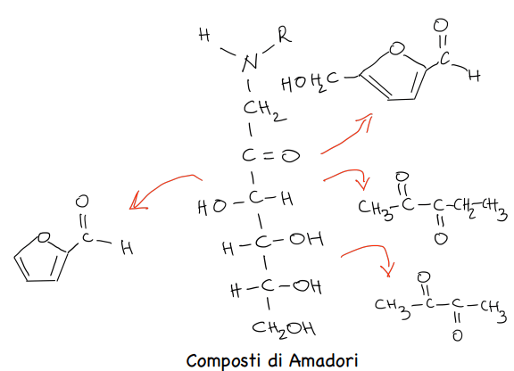 - La prima fase di condensazione tra molecole di zucchero e una proteina e formazione di un composto chiamato di Amadori. Questi composti possono essere molto diversi e cambiano a seconda dell’amminoacido e dello zucchero.