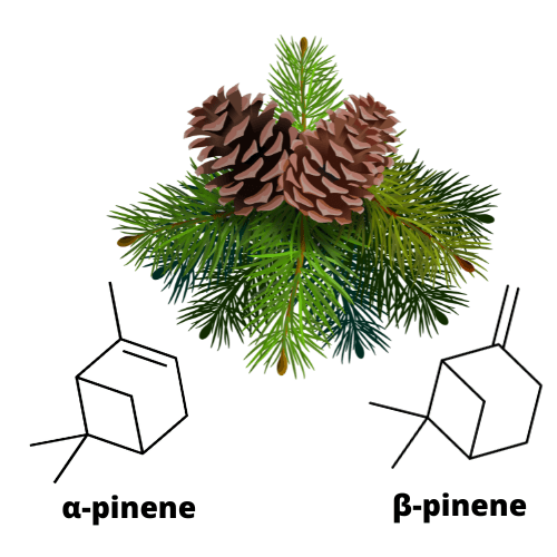 Appartiene alla famiglia dei terpenoidi, un tipo di molecole organiche, in particolare è un monoterpene biciclico e può avere tre forme diverse, identificate dalle lettere greche α, β e γ. L’abete, in particolare, rilascia α-pinene, utilizzato anche per la produzione di caramelle balsamiche e componente dell’olio essenziale di rosmarino. È un ottimo repellente per gli insetti.