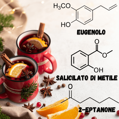 Come potete intuire gli aromi sono dovuti a moltissime molecole, anche se il vin brulé deve il suo aroma piacevole e speziato soprattutto all’eugenolo, un composto organico membro della classe chimica dei cosiddetti allilbenzeni. Si estrae dai chiodi di garofano e anche dalla cannella.