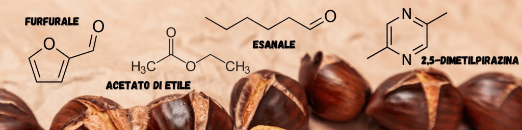 Le castagne, inoltre, sprigionano anche monoterpenoidi e derivati di butano, pentano, esano ed eptano. Altre molecole contribuiscono alla creazione di questo tipico odore, come la 2,5-dimetilpirazina, associabile all’odore di nocciolina, di legno o addirittura di muffa. E’ un composto eterociclico volatile della classe delle pirazine, e il gamma-butirrolattone, che ricorda il profumo del caramello.
