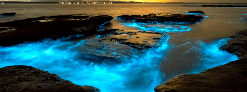 La più spettacolare manifestazione di bioluminescenza rimane forse quella proveniente dal plankton dinoflagellate, che illumina le onde di un colore blu brillante talvolta visibile sulla superficie dell’oceano. Questa volta la luciferina responsabile e’ la dinoflagellate, che illumina le onde di un colore blu brillante.