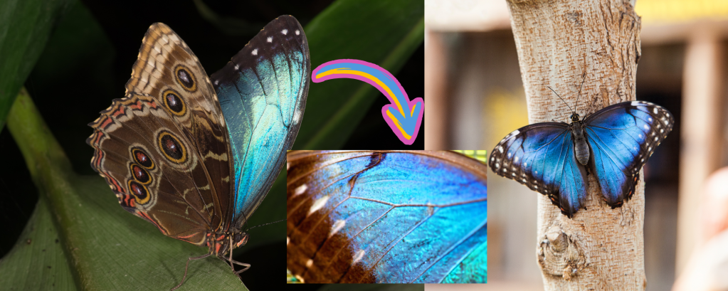 Altri esempi di blu strutturale in natura sono ad esempio le ali della farfalla Morpho. Le sue squame contengono minuscole lamelle disposte a distanze precise, che riflettono selettivamente il blu.