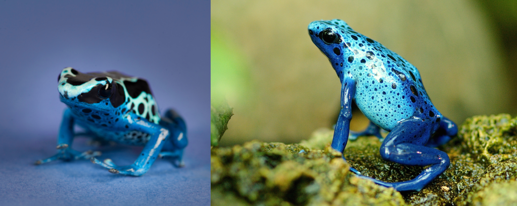 Oppure la pelle della rana Dendrobates tinctorius, le cellule cutanee contengono nanostrutture che riflettono il blu con alta efficienza, cioè agiscono come una sorta di “griglia” microscopica. Quando la luce colpisce queste nanostrutture, viene riflessa, diffusa e interferita in modo tale da selezionare determinate lunghezze d’onda. In particolare, queste strutture riflettono in modo più efficace la luce blu.