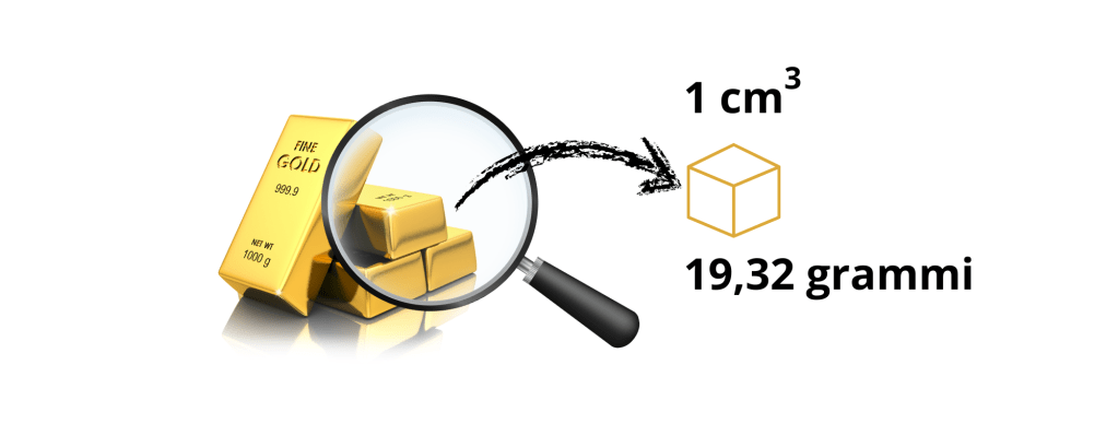 Cosa significano questi valori? Prendiamo l’oro, con la sua densità di 19,32 g/cm³, significa che un cm3 di oro ha una massa di 19,32 grammi. Un cubo d’oro da 1 cm³ pesa quasi 20 volte l’acqua.