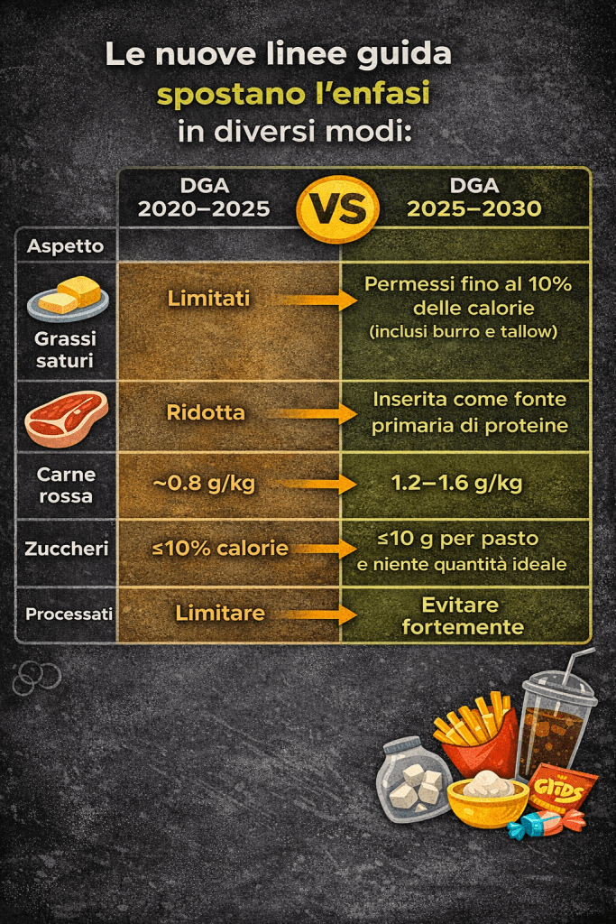 Insomma si direbbe che la nuova edizione ritorna a un modello più orientato agli alimenti “tradizionali” e nutrient-dense (anche animali), sacrificando molte delle famose raccomandazioni “basate sulla riduzione di grassi saturi”.